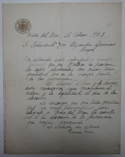 Carta del presidente Germán Riesco al Intendente de Angol, Alejandro Larenas, para solicitarle que le mantenga informado sobre las elecciones parlamentarias del 1° de marzo de 1903. Surdoc: 3-18039