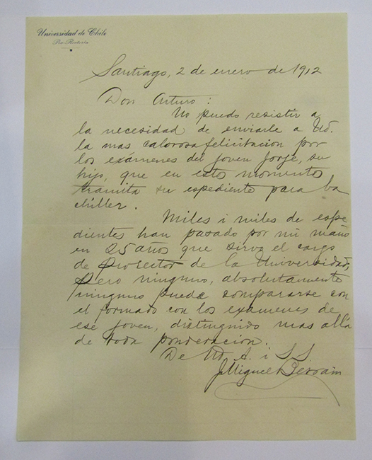 Carta del Pro-rector de la Universidad de Chile, José Miguel Besoaín, a Arturo Alessandri por los destacados exámenes realizados por su hijo Jorge. Surdoc: 3-19589